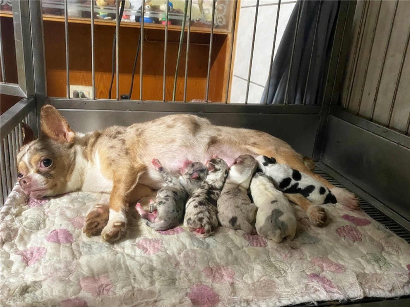 居住 : 4隻吉娃娃住一間寬6呎×深2呎白鐵自動沖洗籠,採籠內小木屋控溫飼養。