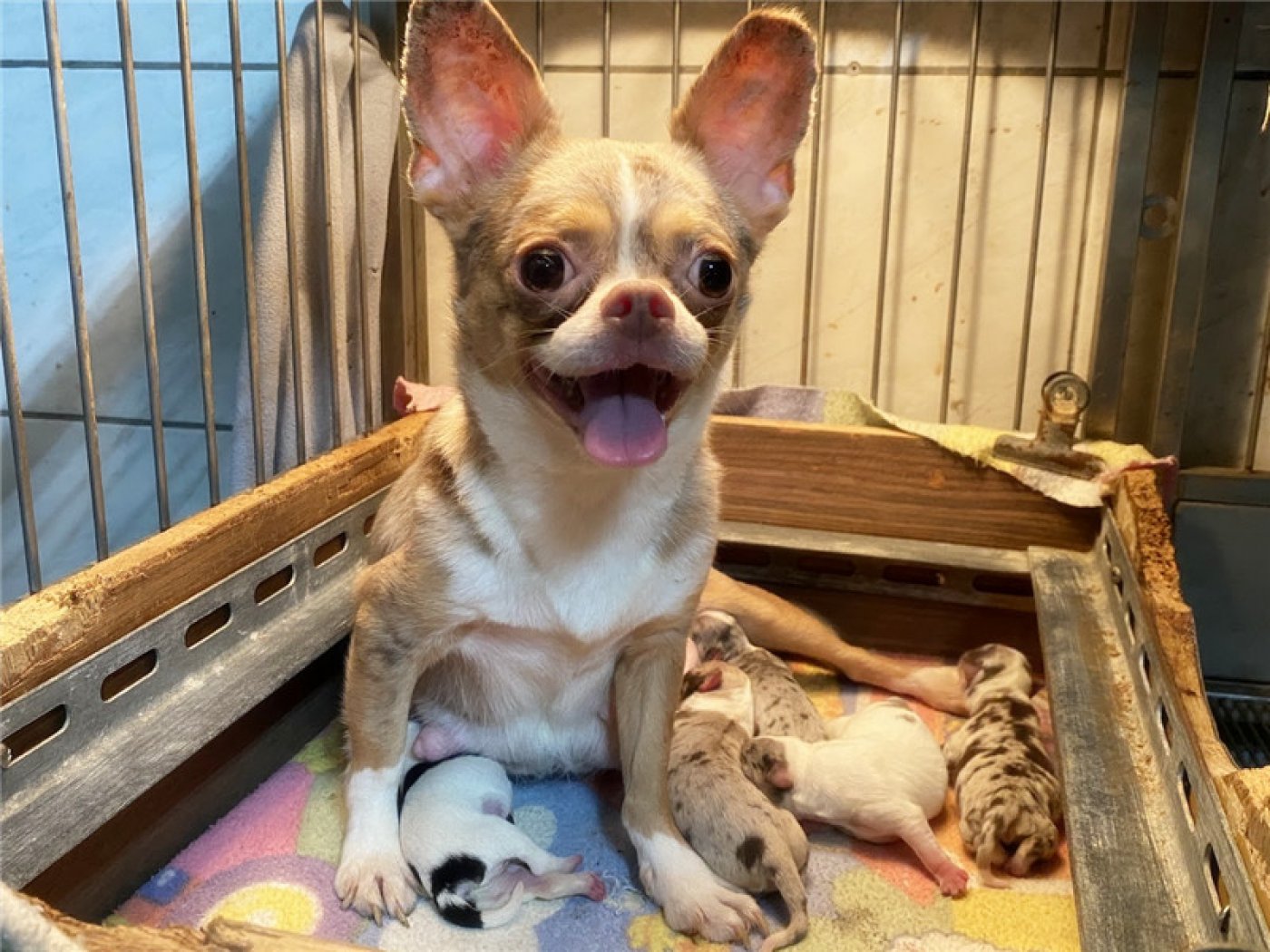 居住 : 4隻吉娃娃住一間寬6呎×深2呎白鐵自動沖洗籠,採籠內小木屋控溫飼養。