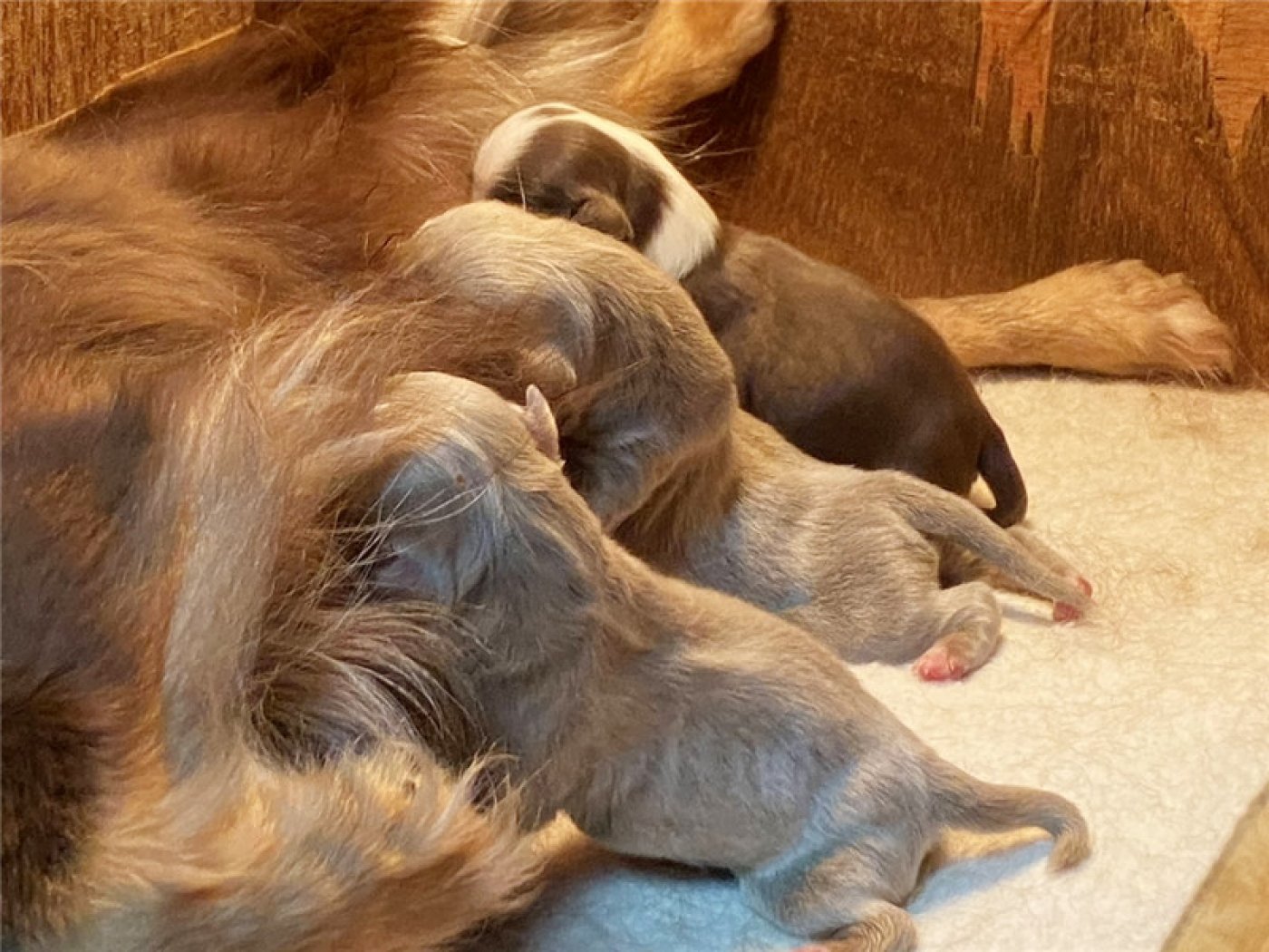 剛出生仔娃前三周,母犬的重點是關心幼犬的生存,以及食物,溫暖,和安全。如果這時候去打擾去碰觸幼犬會造成母犬心理極大壓力和害怕。甚至嚴重時會含咬幼犬離槽藏躲,造成幼犬保暖不夠或擠壓窒息而死亡或受到驚嚇踩死幼犬。第四周,幼仔的需要仍以母犬為中心,在母親離開窩時提供溫暖和安全,也就是前四周交給母犬就可以了。作主人的狗爸只要照護好母犬不受干擾讓母犬專心盡責照顧好小孩。