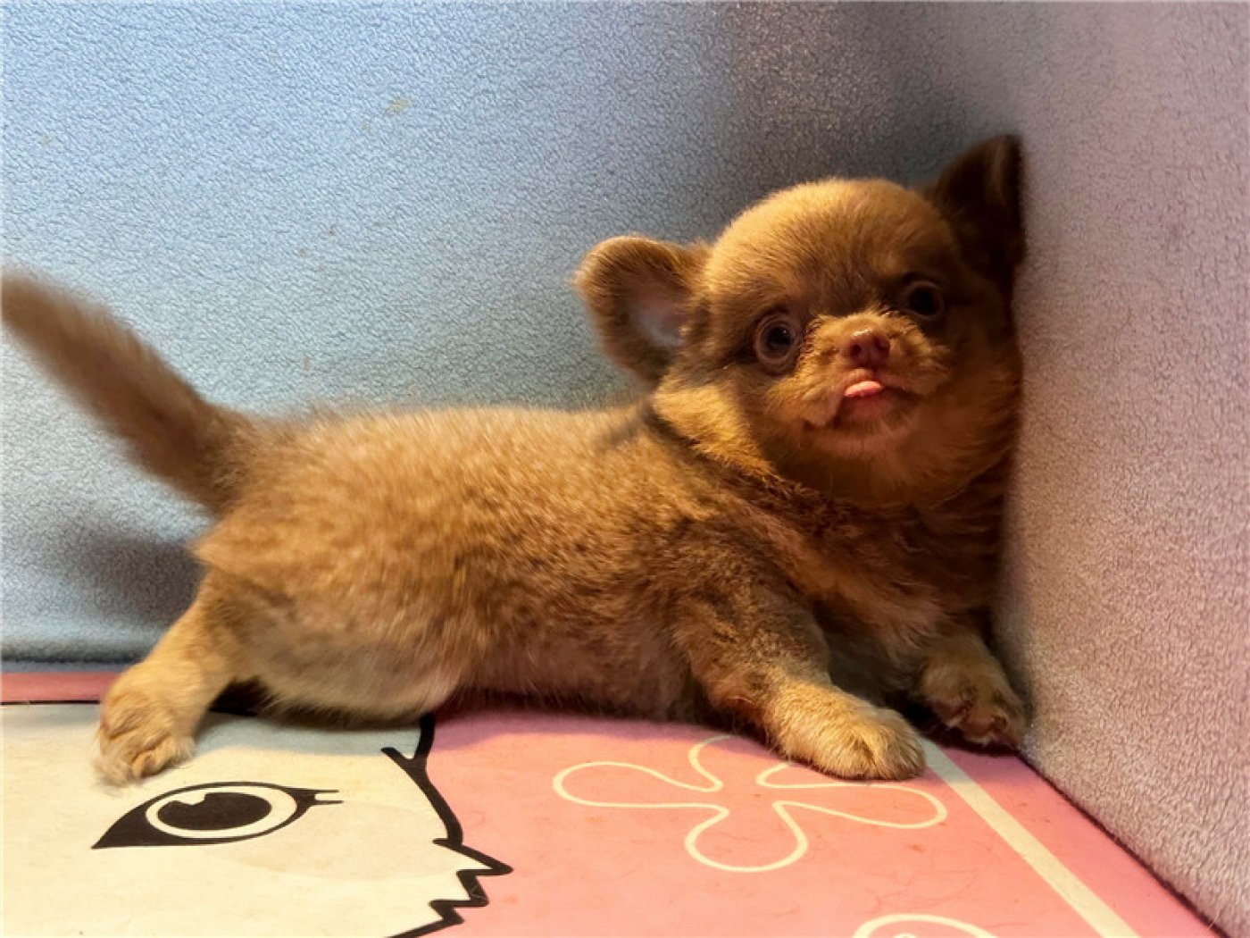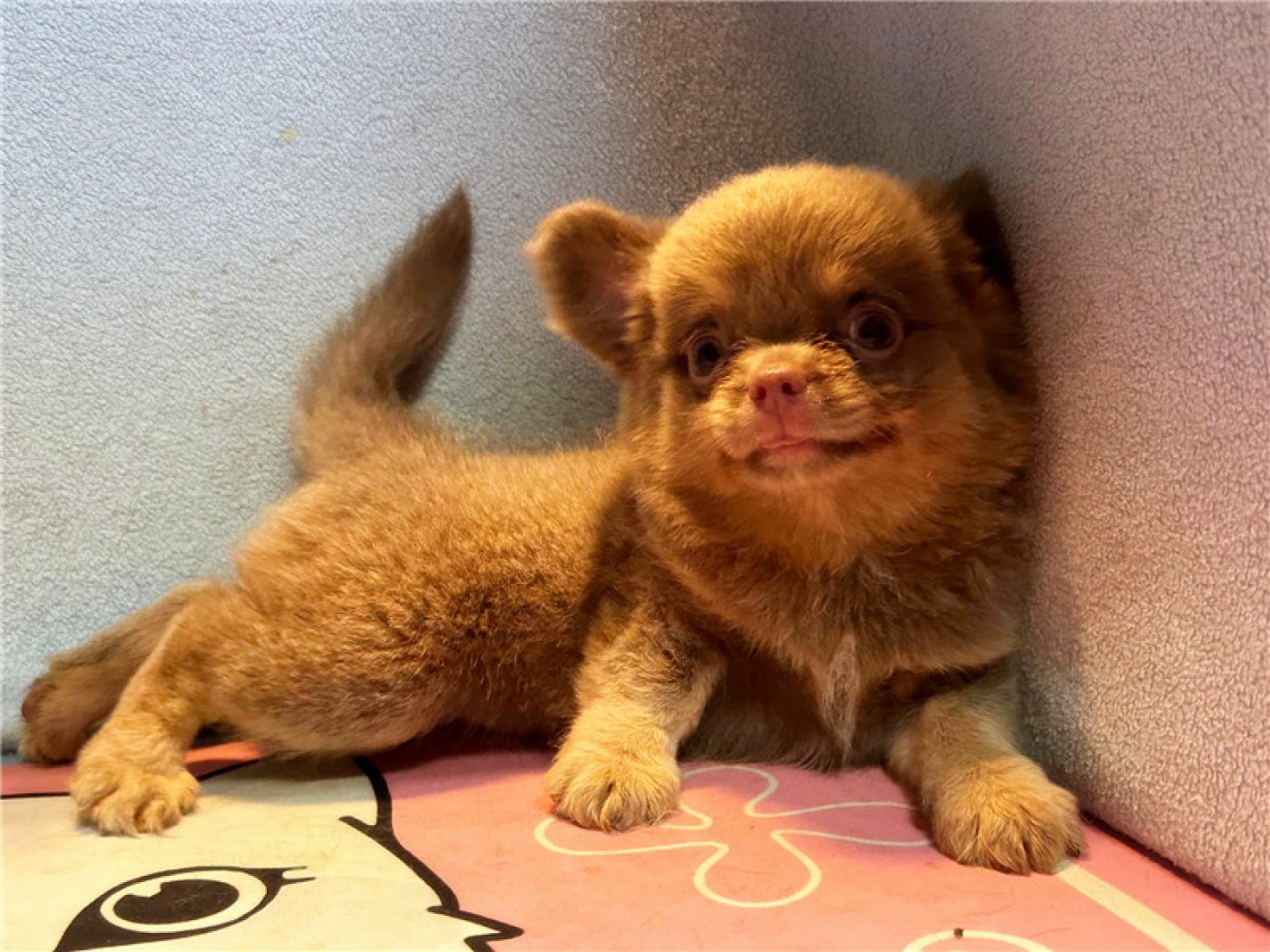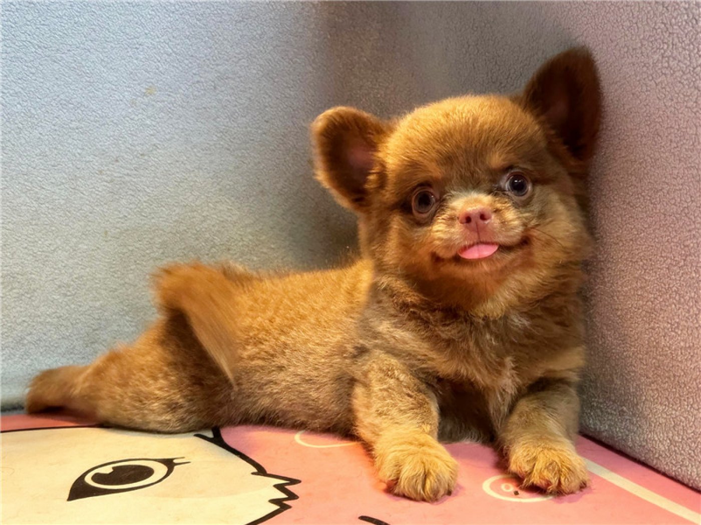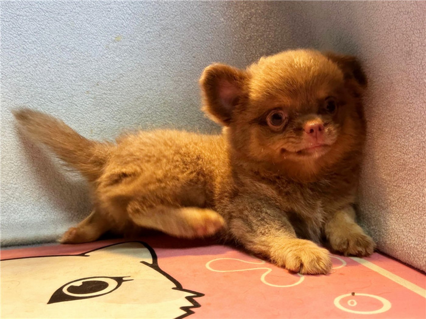 居住 : 4隻吉娃娃住一間寬6呎×深2呎白鐵自動沖洗籠,採籠內小木屋控溫飼養。