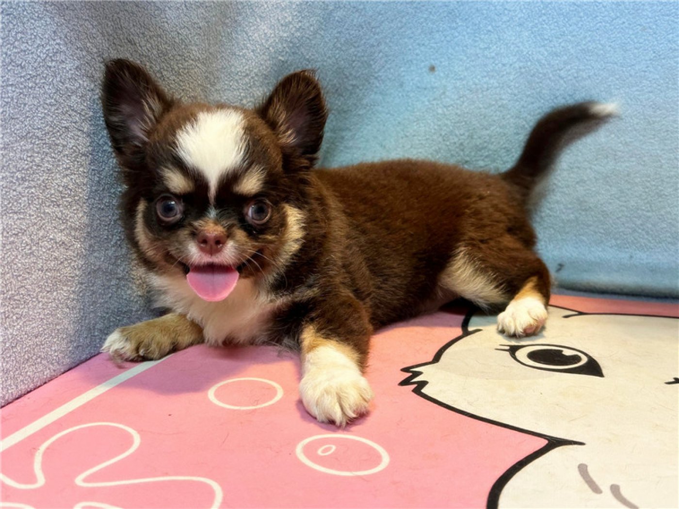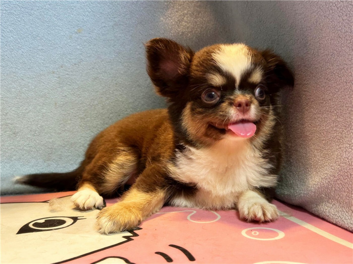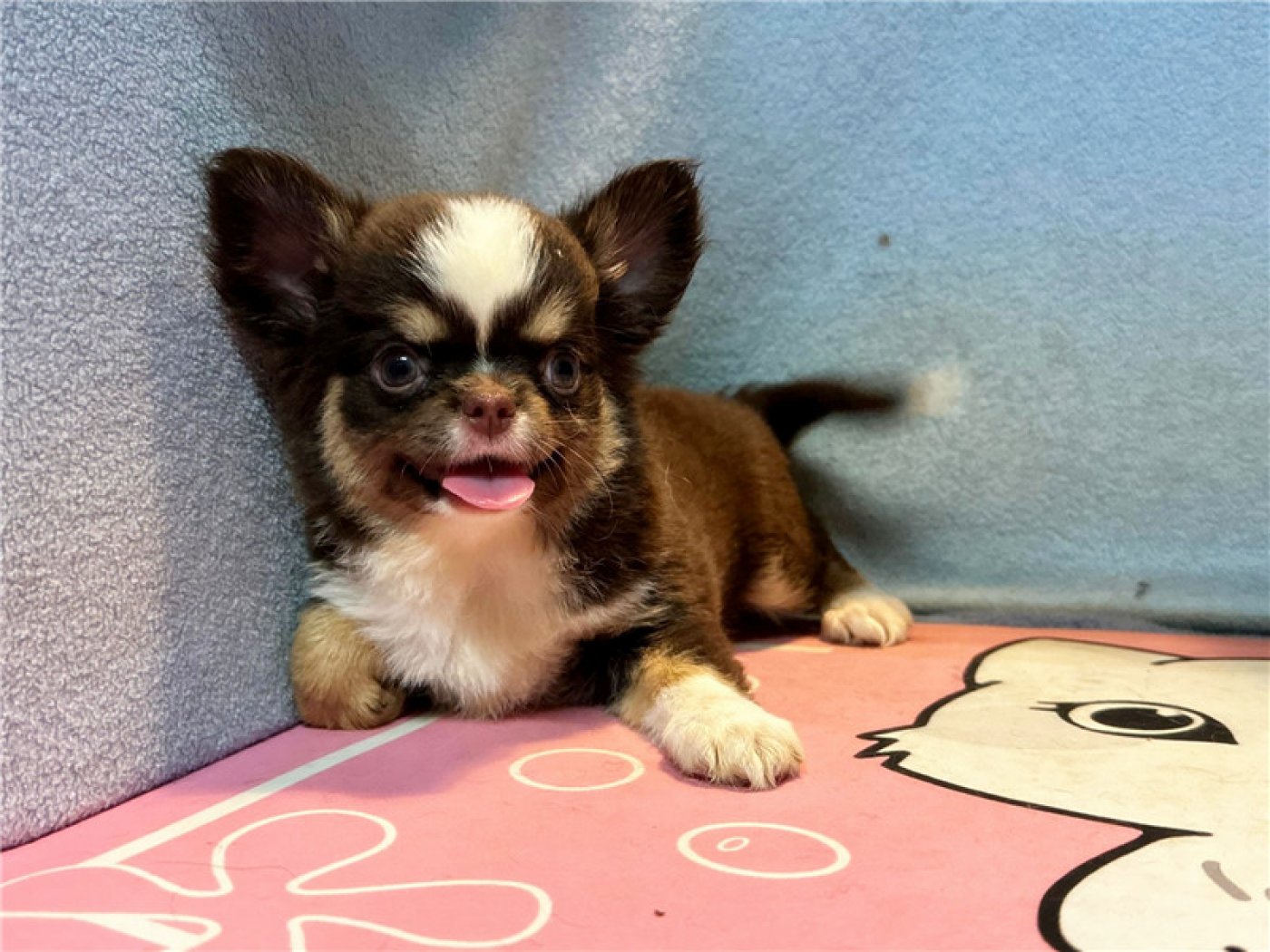 居住 : 4隻吉娃娃住一間寬6呎×深2呎白鐵自動沖洗籠,採籠內小木屋控溫飼養。