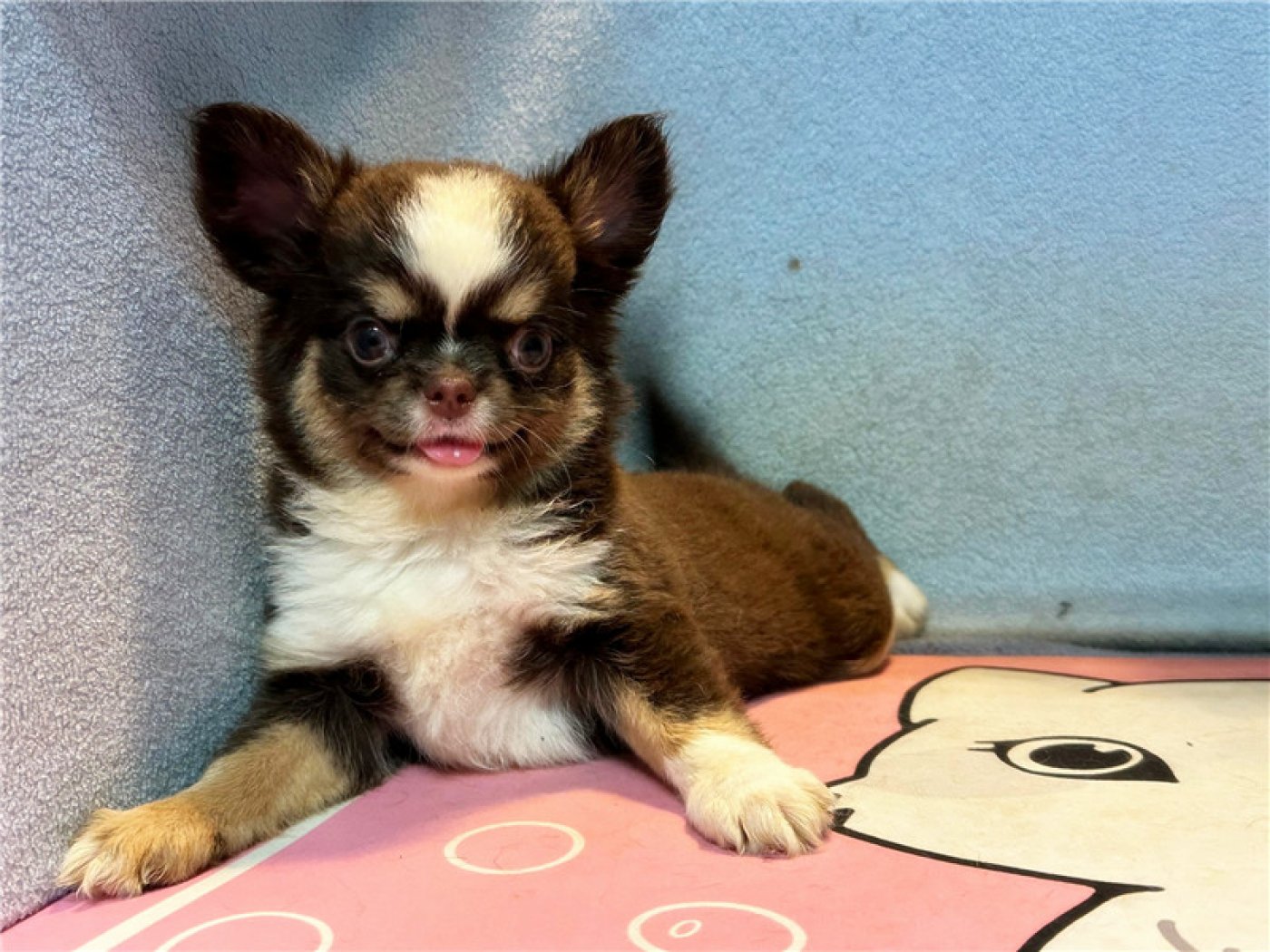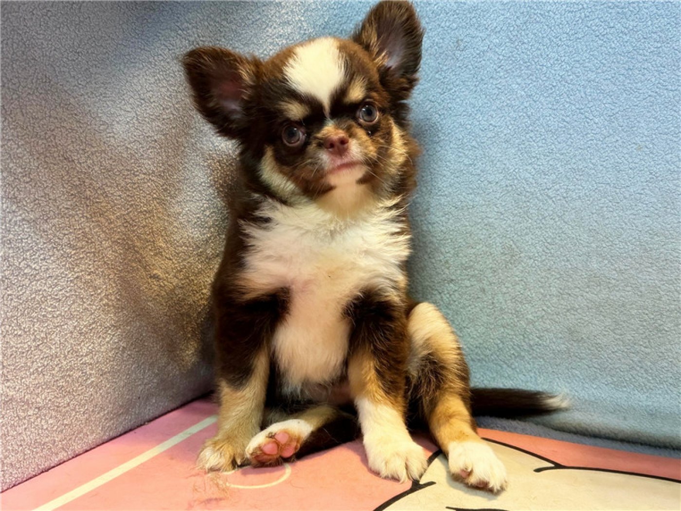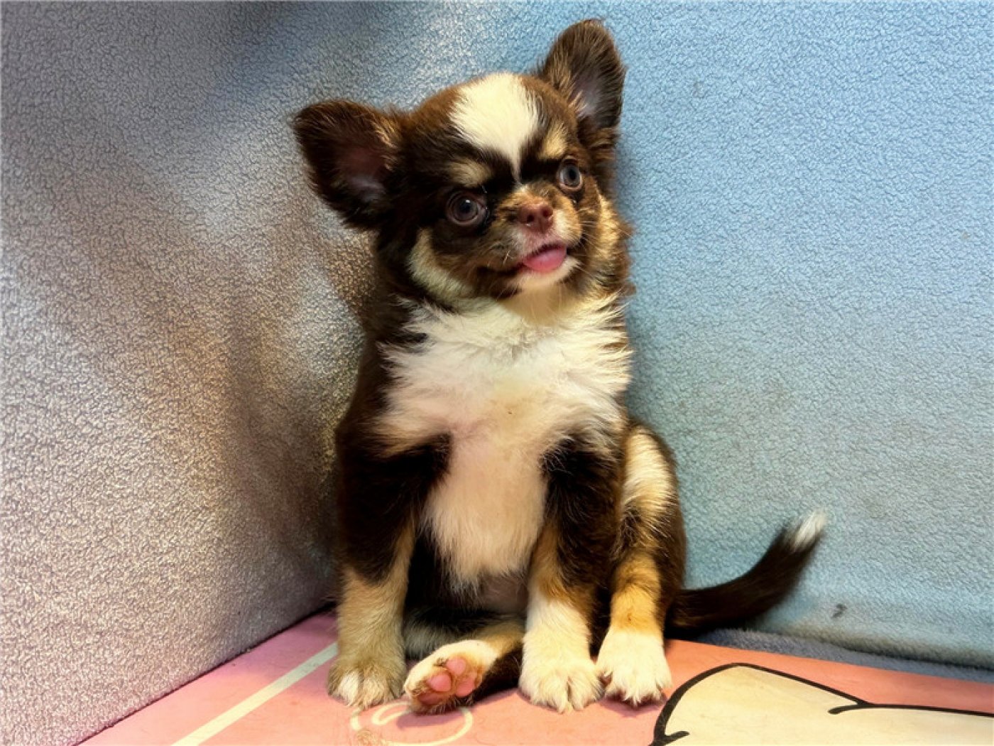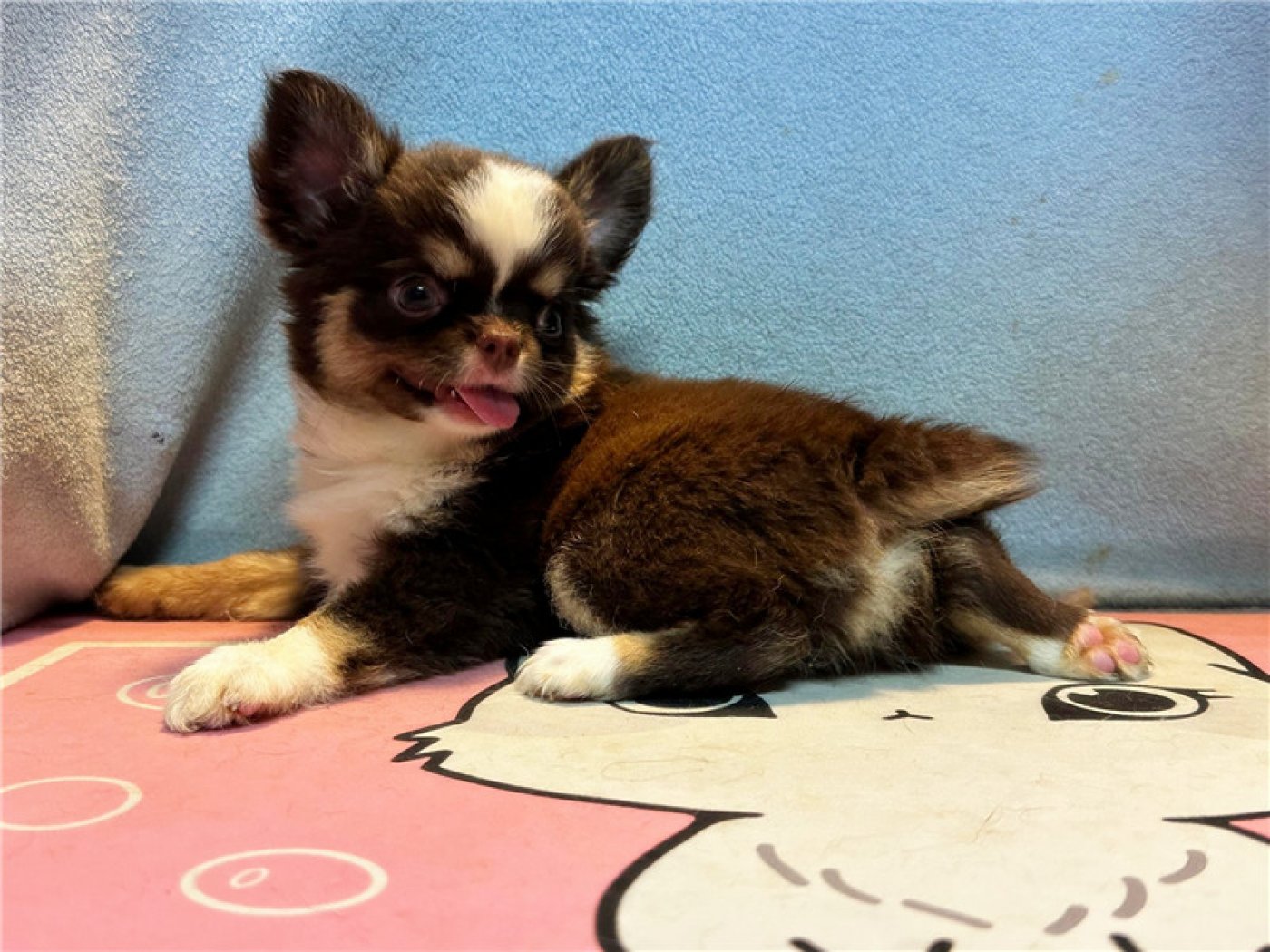 居住 : 4隻吉娃娃住一間寬6呎×深2呎白鐵自動沖洗籠,採籠內小木屋控溫飼養。